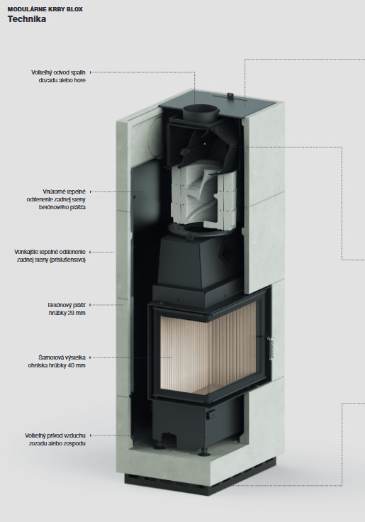 Modulárne krby BLOX - tieto produkty sú jedinečnou kombináciou technológie a dizajnu. Vyznačujú sa najmä rýchlou a intuitívnou inštaláciou. Pozostávajú z krbovej vložky, oceľového podstavca so špeciálnymi lištami pre prívod vzduchu a betónovej obstavby. Voliteľne si pri konfigurácii produktu môžete vybrať medzi klasickou konvekčnou prevádzkou alebo akumulačným vykurovaním.